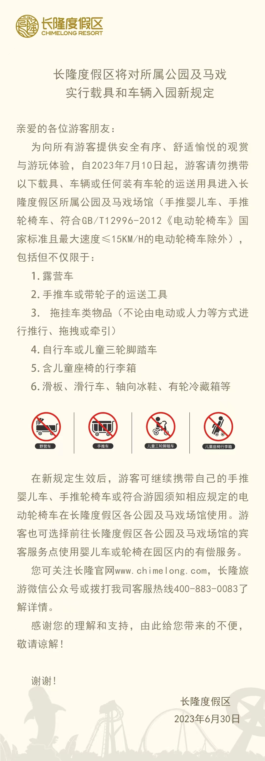 含儿童座椅的行李箱、滑板、滑行车、轴向冰鞋、有轮冷藏箱等。在新规定生效后,进入长隆园区的游客可继续携带自己的手推婴儿车、手推轮椅车或符合游园须知相应规定的电动轮椅车在长隆度假区各公园及马戏场馆使用。游客也可选择前往长隆度假区各公园及马戏场馆的宾客服务点租赁婴儿车或轮椅。