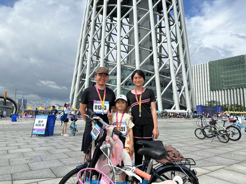“有点累,但是很开心。”记者在现场遇到8岁的林家瑶小朋友,问及累不累,她笑着大声回答,原来小小年纪的她还是个骑行爱好者, “我很喜欢骑车,今天是我骑得最远的一次。”林家瑶站在自己粉色的童车前自豪地说。林爸爸告诉记者,“我们住在从化,凌晨四点多就起来了,开了一个小时车赶到这里。”妈妈则坦言,自己平时骑车并不多,这次陪着小孩来,为了方便装车还专程买了两辆小一些的新自行车。