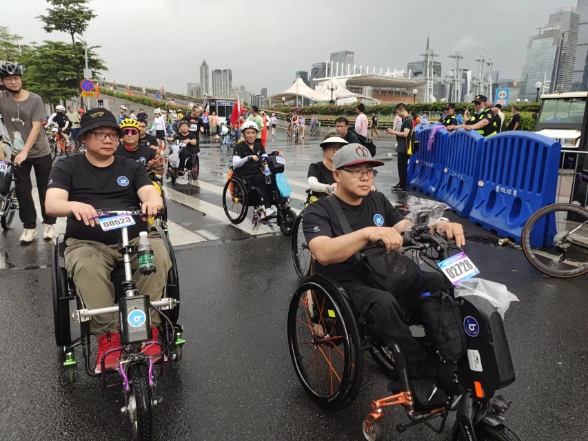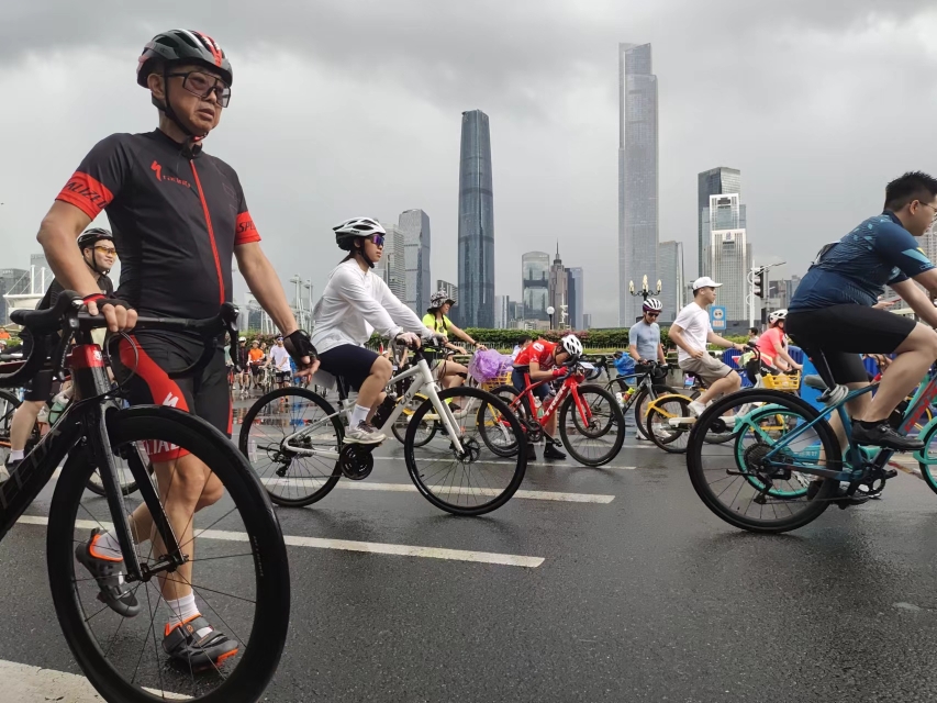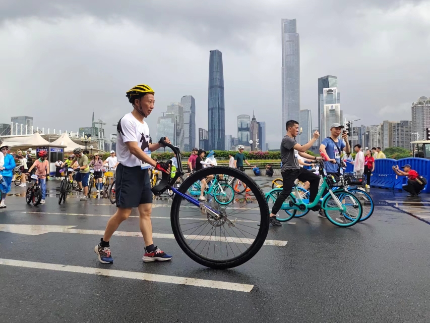 7时40分左右,一场雨不期而至,现场的骑手忙着找地方避雨。好在十多分钟后,雨势渐小。8时左右,随着现场广播发令响起,约3000名骑手陆续推车从广州塔二楼平台起点分批出发,沿着阅江路一路向东。