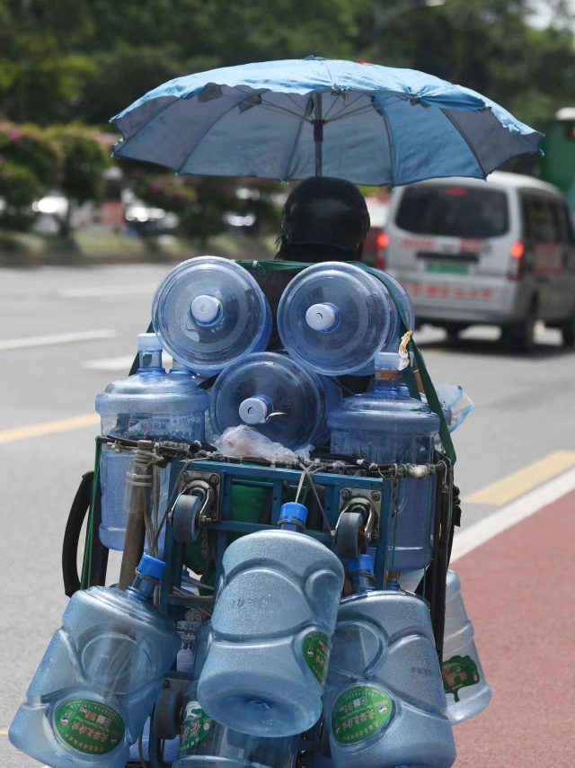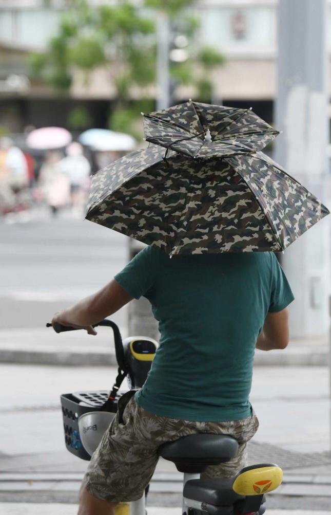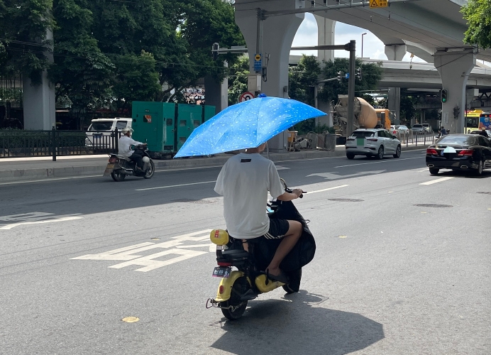 7月1日,记者走访越秀区、海珠区、白云区部分区域发现,路面行驶的电动自行车中,仍有少数加装了遮阳伞,也有一小部分车主为了骑行方便拆掉了脚踏(脚蹬)。在昌岗路江南大道交界路口,个别车主为了防晒甚至放弃了头盔改用头戴式遮阳伞。