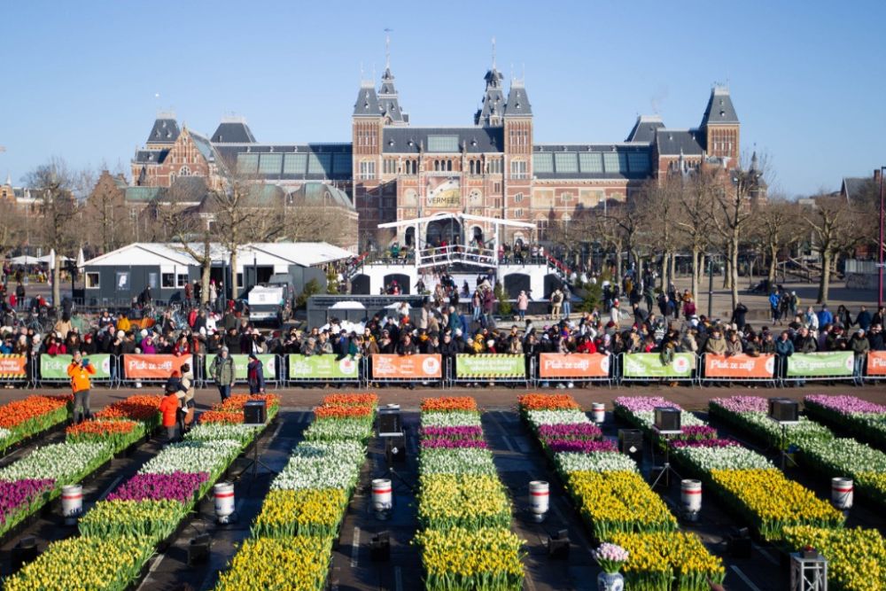 1月21日,荷兰阿姆斯特丹的皇家博物馆前摆着色彩斑斓的郁金香。新华社发(西尔维娅·莱德雷尔摄)
