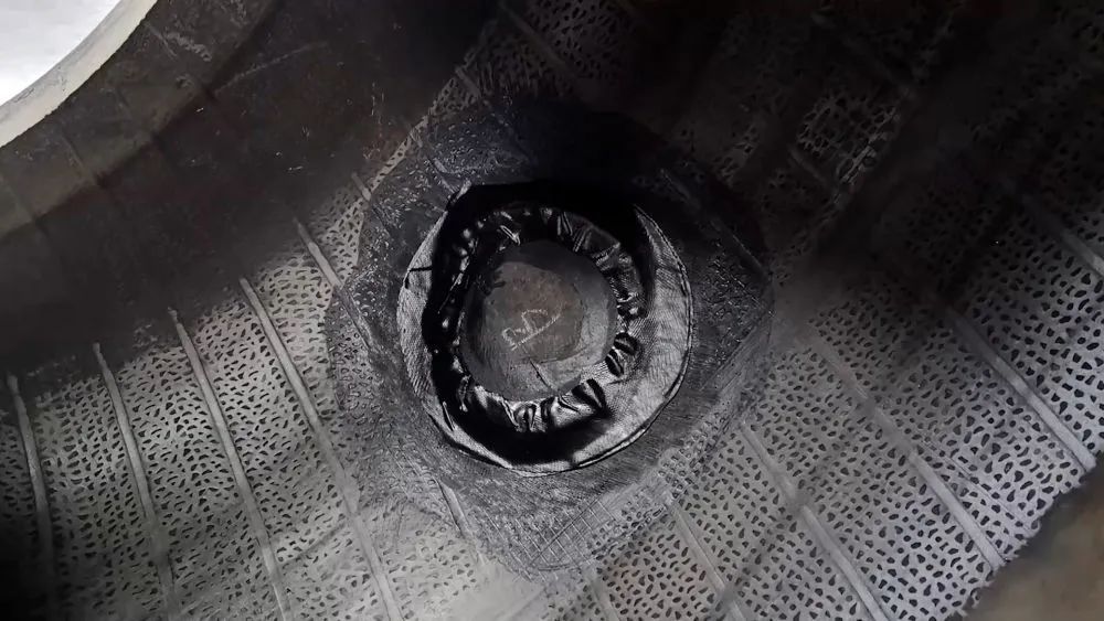 在汾阳市史家堡村的一个轮胎翻新车间,正在翻新的一个工程轮胎的最里层,有一个直径约10厘米的圆形补丁,气密层明显遭到损伤。