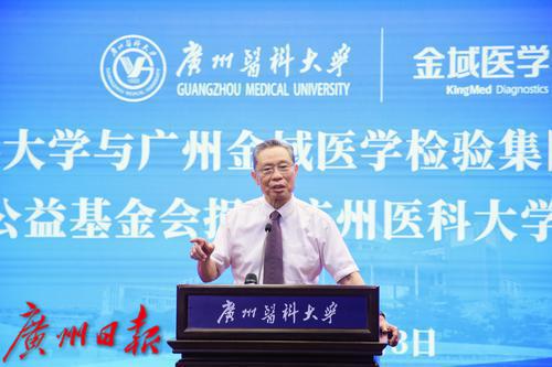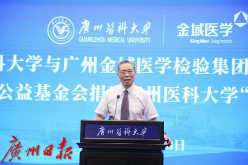 7月3日,广州医科大学与广州金域医学检验集团战略合作签约暨捐赠仪式在广医番禺校区举行。金域医学向广医捐资人民币1亿元,用以建设“金域楼”以及推动教学科研工作。双方将在产业学院建设、人才培养、技术攻关等领域进行深度合作。根据合作协议,双方将金域检验学院打造为国家现代产业学院的典范,将国家级一流本科专业医学检验技术专业建设成为全国高等医科院校同类专业的标杆,培养适应经济社会发展需要的复合型、创新型、应用型的高素质医学检验人才。拟建设的“金域楼”位于番禺校区;建成后,“金域楼”地上、地下总建筑面积约为15,000平方米。 参加仪式的“共和国勋章”获得者、广医老校长钟南山院士在讲话中表示, 双一流大学的建设不能停留在盖楼、发论文的层面上,应该勇于开展教育创新,行业龙头企业的加入就提供很大帮助,培养出马上就能用的高素质人才,校企合力为国家的创新发展和人才强国建设,提升教育水平贡献更大力量。