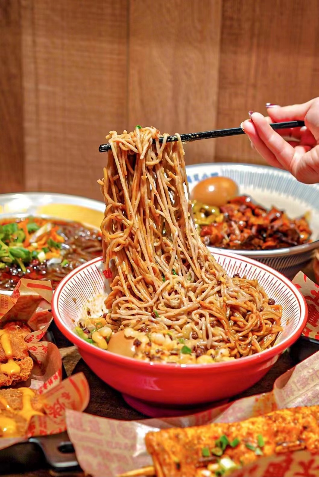 豌杂面是重庆小面品类中最具代表性的产品之一,据介绍,遇见小面红碗豌杂面是按重庆老饕最爱“干溜”做法出品,即不带汤的小面,味道浓烈干香。为了照顾不同地区的口味,还提供“重庆辣”“微辣”两种辣度给顾客选择。在社交平台上,其广受好评的产品除了红碗豌杂面和金碗酸辣粉外,还有焦香烤猪蹄和抄手系列。这是小面产品之外的另一大产品特色。