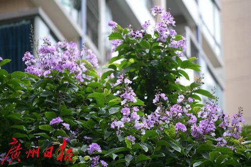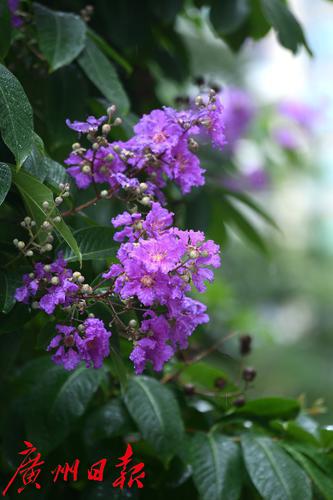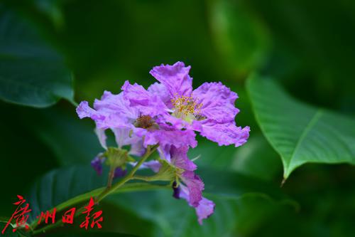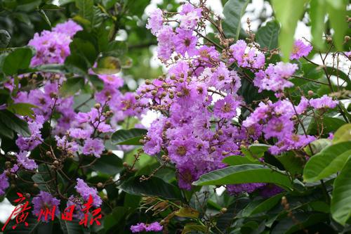 大叶紫薇为千屈菜科紫薇属落叶乔木,我国广东、广西、云南、福建、海南等地引种栽培。大叶紫薇花大色艳,花期5~9月,历时120日以上,是一种观赏价值很高的园林绿化树种。大叶紫薇具有优良的观赏性状,可以用来改良现有的紫薇品种。广州街头不难发现大叶紫薇的身影。这是一种大乔木,高可达25米。花淡红色或紫色,花期5-7月。