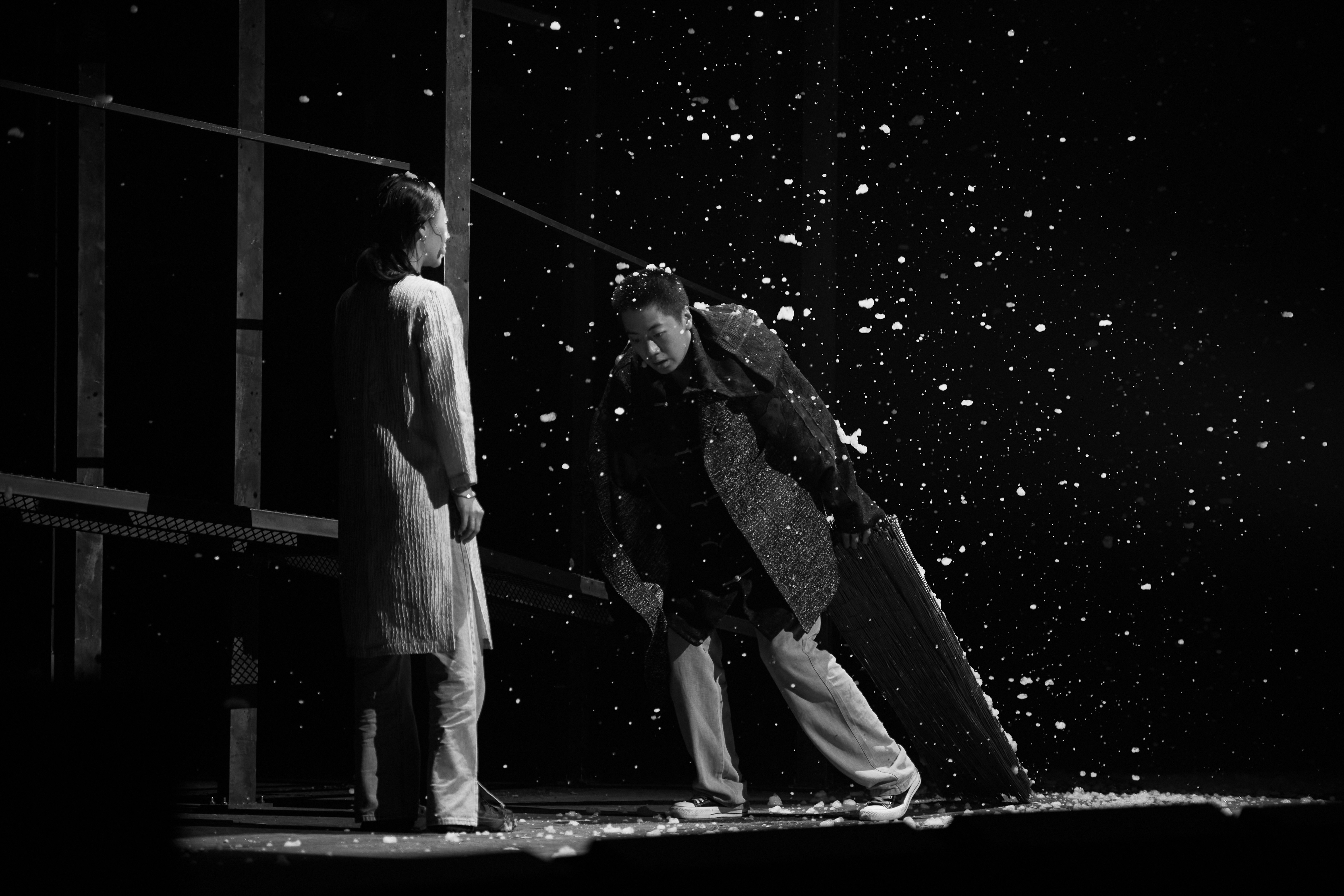 导演何念在随后接受媒体采访时介绍,这个转台就是对戏中人物的阶级性以及生命节奏的象征。“舞台剧《骆驼祥子》由旋转和升降两种空间动作组成,在转台的中区还设有12块可以分别上升下降的铁板,铁板上有铁门和小窗,在使用上可以多层次的组合画面,切割空间,可以更流畅的转换场景。在铁笼中间设置了一个6米直径的升降板,这个是整个作品的戏剧焦点,演员可以‘从天而降’,也可以从地面上升,此时升降的空间动作对人物命运进行相应呼应。在升降平台的中心位置设置为主要表演空间,以简洁便携的道具组织为多个重要场景。演员们在此空间中腾挪移动,体现了在阶级固化后的社会中,祥子作为底层劳动者的挣扎,年轻时的意气风发、无限期待,中年时对与命运的妥协与无奈都在此空间中被放大。”