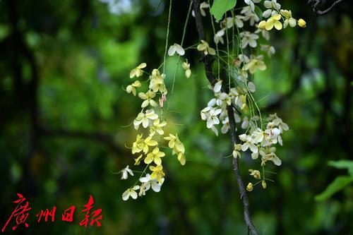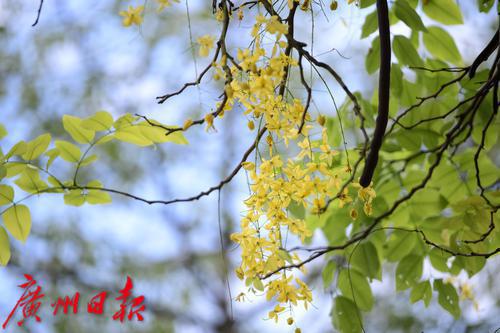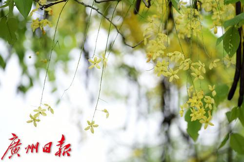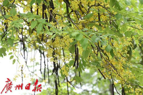 7月4日,临江大道带状公园增添了一抹金黄色,一种平日青翠而平平无奇的树开满金黄色的花朵,这种名为“腊肠树”的树木有着浓浓的烟火气。花絮随风摇曳、金黄色的花串满挂枝头,花瓣飘落满地,放眼望去尽是金黄,俨然下了一场“黄金雨”,所以又名“黄金雨”、“金急雨”。等到花期过后,树上会结出长条形的绿色果实,成熟后会变成黑褐色,形似腊肠。