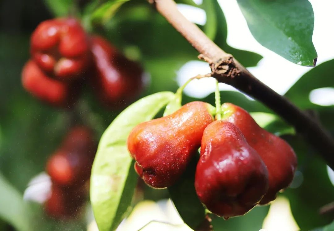 眼下,在温泉镇灌村大尖山仙居果庄的莲雾开始成熟。莲雾口感香甜多汁、果肉爽脆,每咬一口都像咬破一个蓄水小炸弹,炸出大量清甜的汁水,是一种消暑佳果,具有丰富的营养价值。仙居果庄的莲雾来自台湾,从化群山环绕,也有潺潺山水,给了莲雾一个最完美的“家”。走进大棚,只见莲雾果挂满枝头,每一颗红果都十分饱满、色泽鲜艳,在光影交错的绿叶衬托下,更是散发着一种诱人的魅力。今年果庄的第一批莲雾果从6月下旬开始采收,采摘时间能持续至7月中旬。第二批莲雾果预计在8月左右成熟。