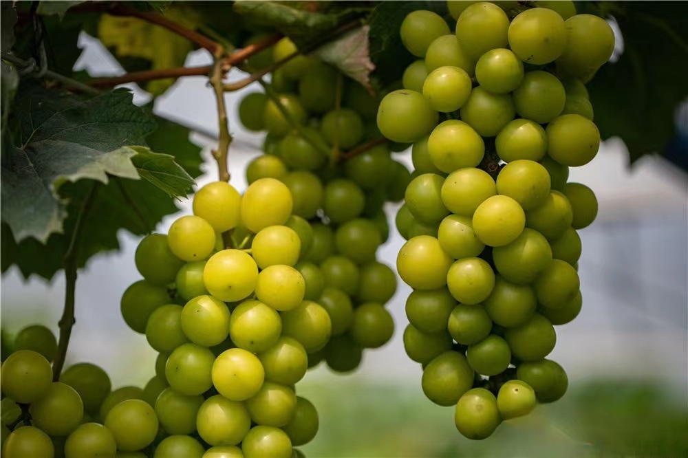 果型圆润,通体翠绿,阳光玫瑰是葡萄科葡萄属植物,果肉厚,因果实含糖量较高,果肉鲜脆多汁,自带玫瑰香味,故名阳光玫瑰。眼下这个时节,在白云区人和镇南方村八岭庄社,有超10万串阳光玫瑰葡萄挂满枝头。果农精心培育,采用有机肥、水一体化种植,让串串葡萄吸足阳光水分,一年只采收一季,预计亩产量4000斤左右。