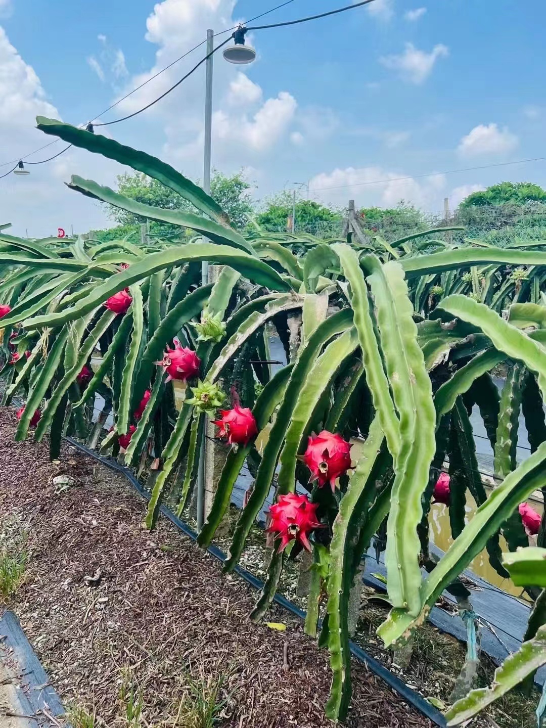 眼下这个季节,走进从化区城康村水果迷城,只见一颗颗红彤彤的火龙果垂挂在仙人掌状的蔓条上,色泽鲜艳、果形饱满、长势喜人,点缀在万绿丛中煞是好看,当中的“翡翠火龙果”更获得国家绿色食品认证。