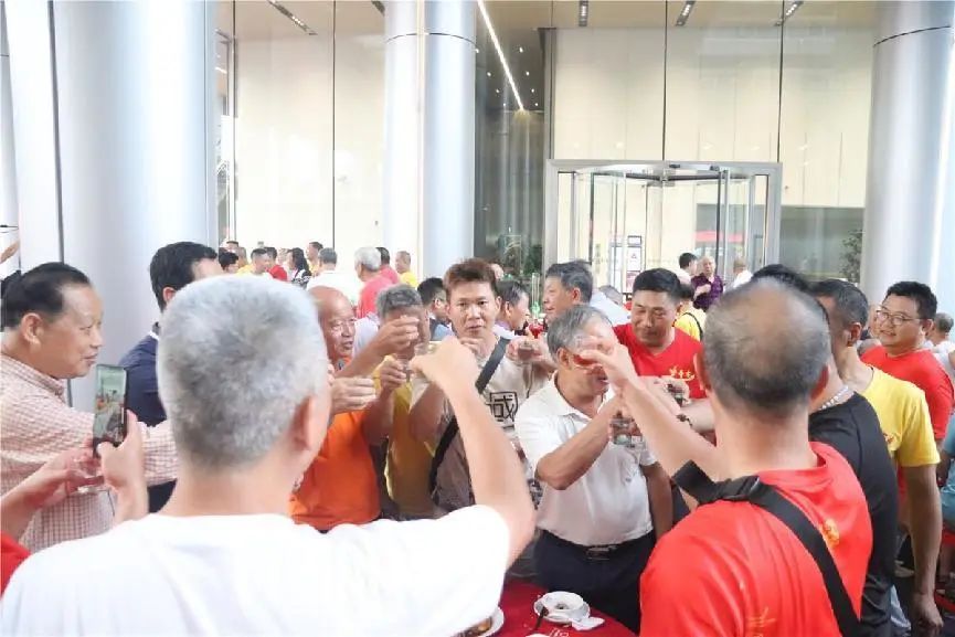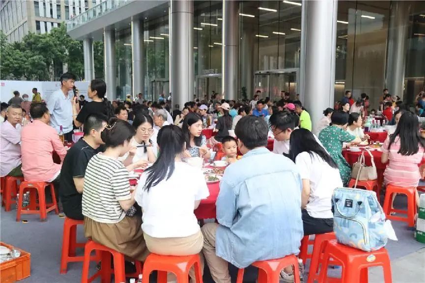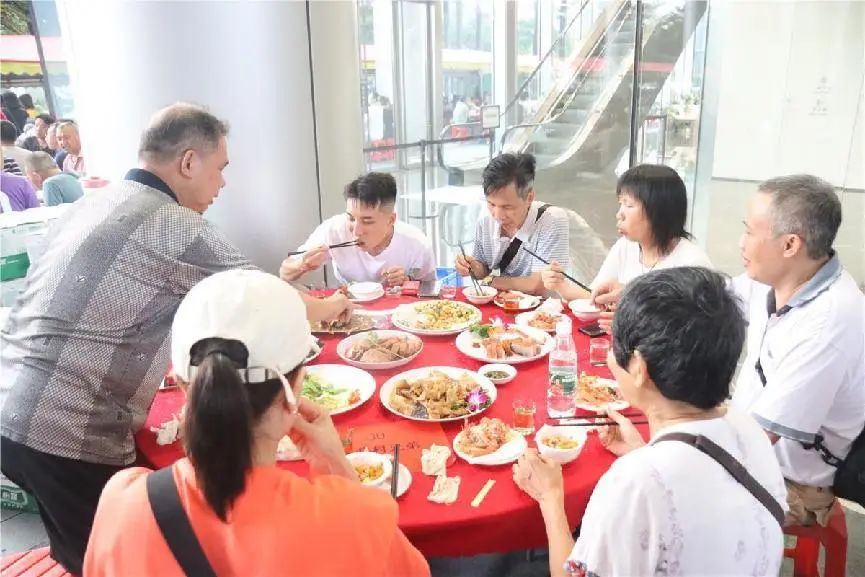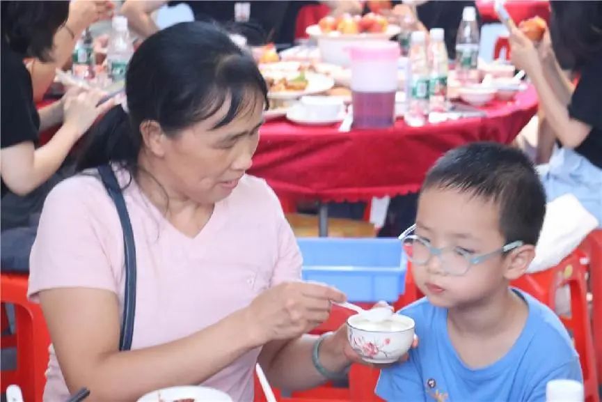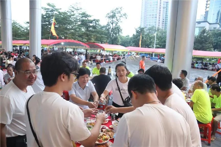 晚上6时许,伴随着阵阵鞭炮声,寺右龙舟饭正式开席。“举杯,饮胜!”村民们举起手中的酒杯,互相表达对彼此的祝福。街坊邻里共同品尝美食,享受惬意的团聚时光。