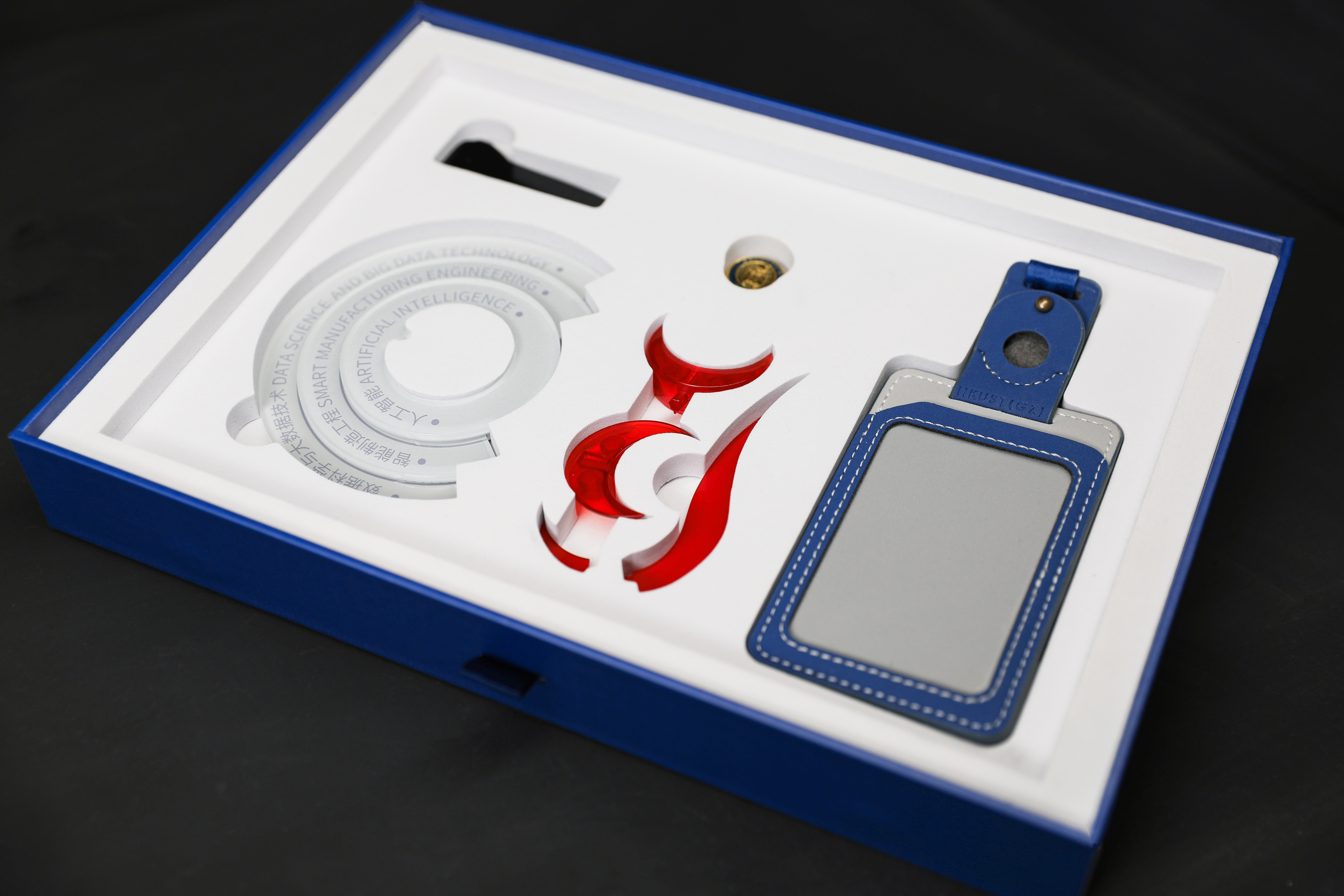 礼盒的外壳采用与港科大一脉相承的品牌颜色,科大蓝与科大金,经典又庄重。