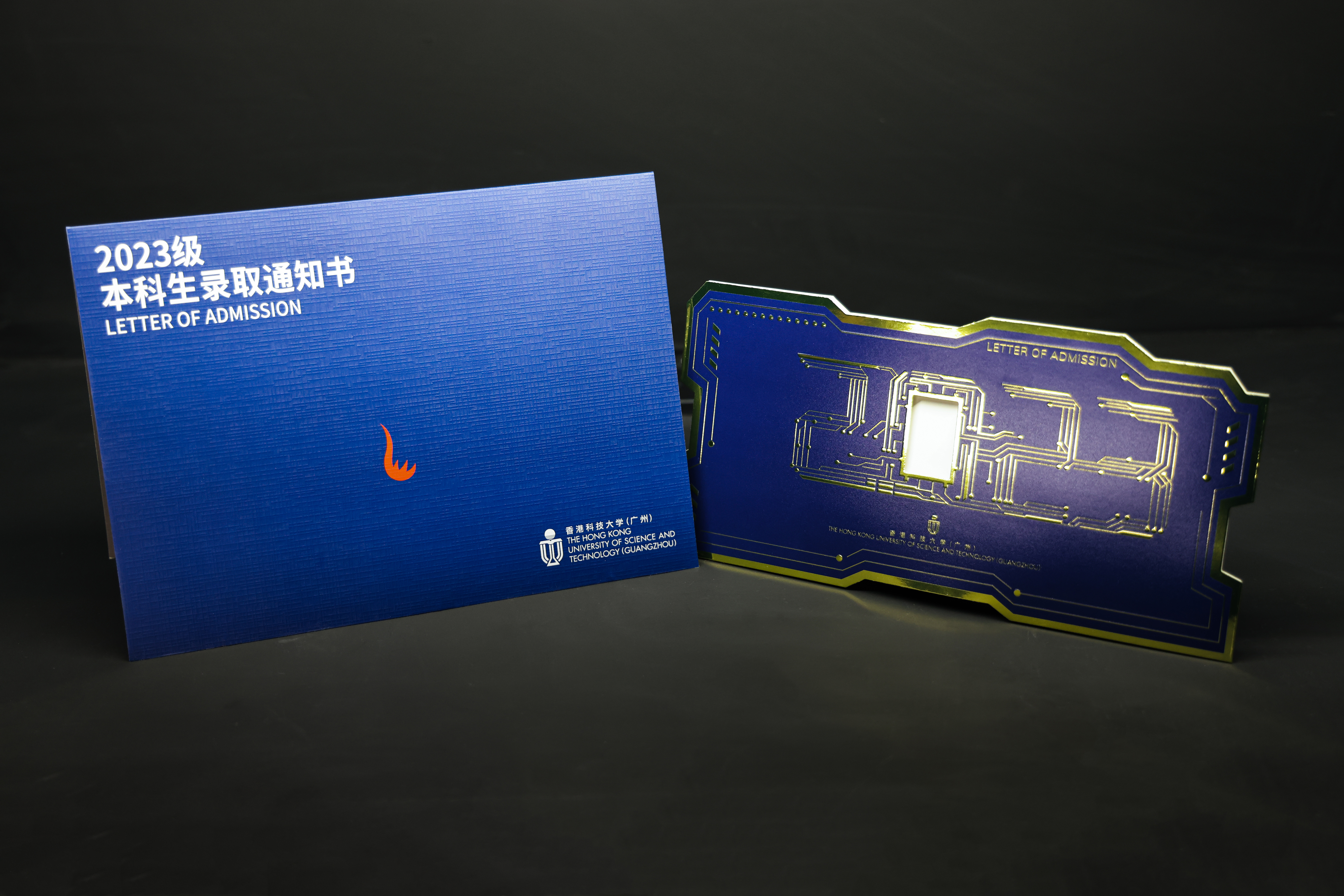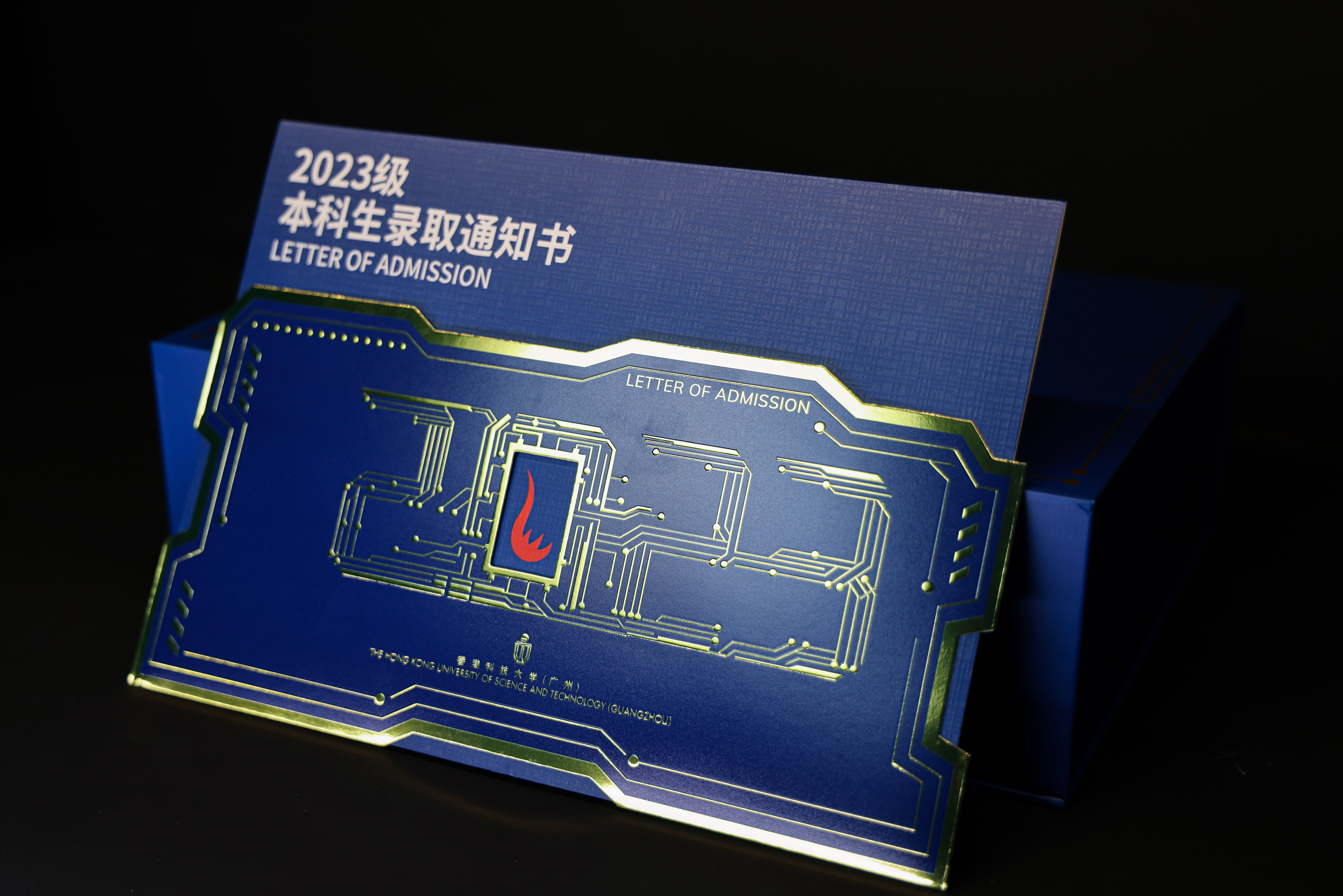 录取通知书则是由富有科技感的芯片外观组成“2023”的数字外壳,芯片的核心,是港科大和港科大(广州)共同的精神图腾——红鸟日晷。