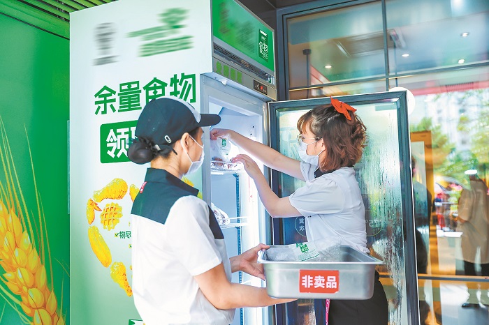 工作人员将余量食物放进“食物驿站”。