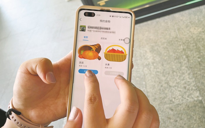 市民用手机预约领取“食物银行”的食品。
