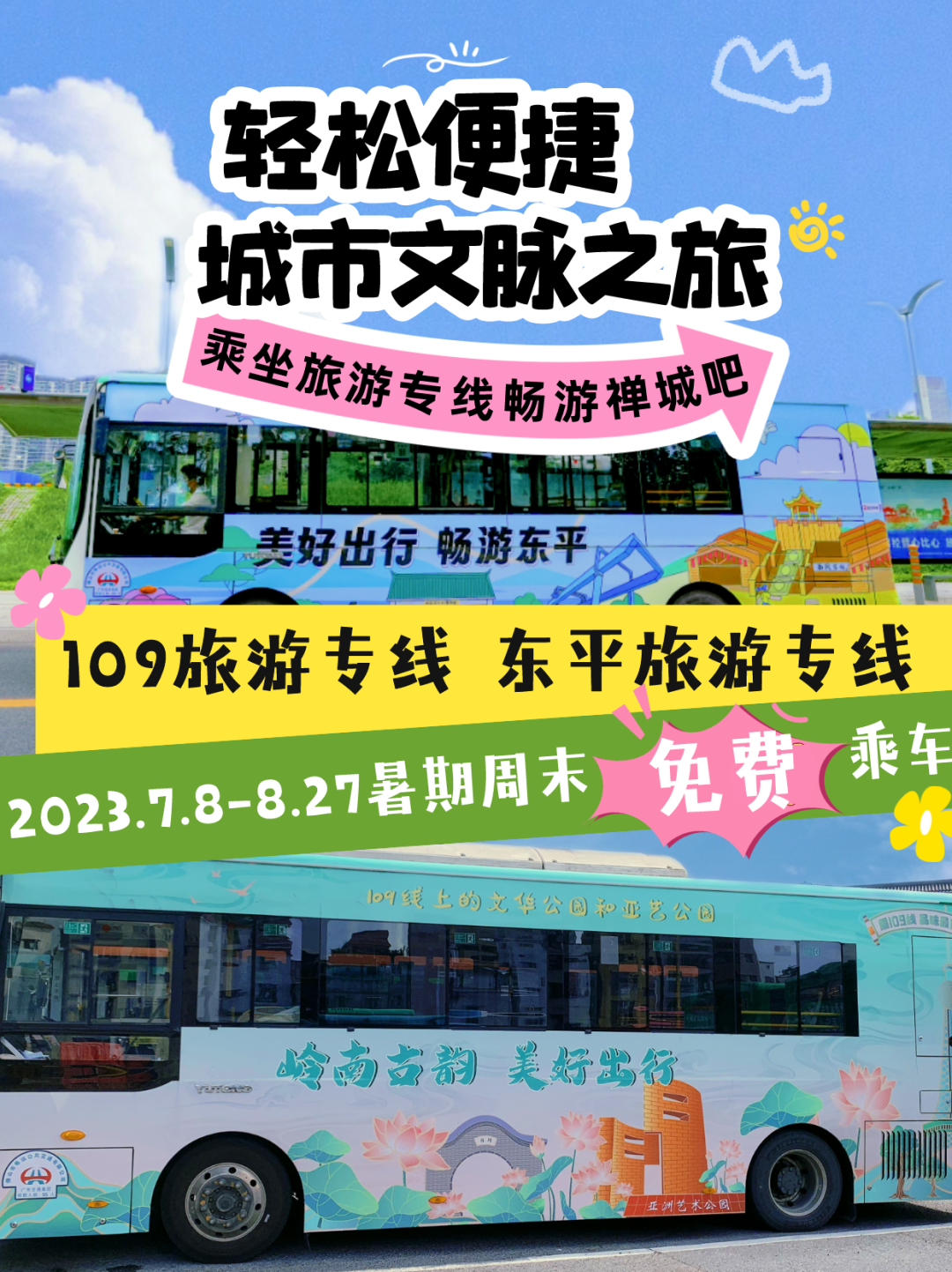 目前,东平路沿线多个主题公园已经开放,市民不仅可以免费乘坐东平路公交专线,还能一路畅游各个主题公园,度过一个惬意休闲的假期。暑假快来了,市民快来 乘坐禅城区的旅游专线109线和东平路公交专线,来一场惬意浪漫的禅城之旅吧。