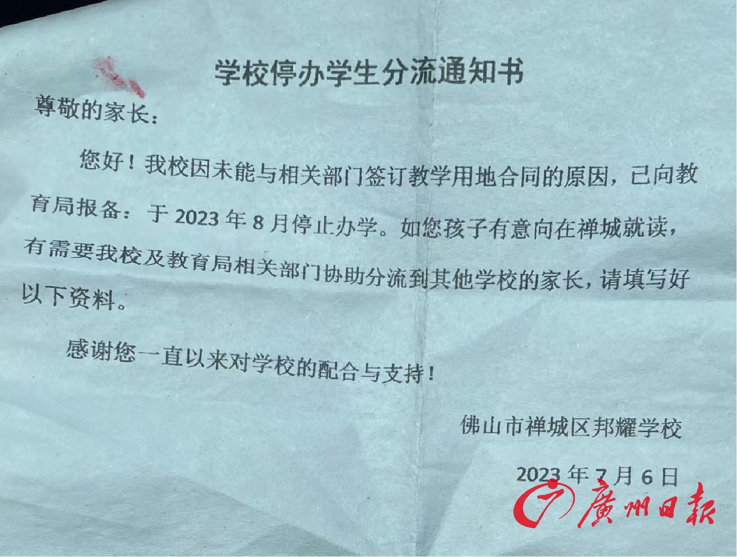 在校门处,记者遇到该校五年级学生家长祝先生,他向记者出示了一份纸质版的学校停办学生分流通知书。该通知书称:“我校因未能与相关部门签订教学用地合同的原因,已向教育局报备:于2023年8月停止办学。如您孩子有意向在禅城就读,有需要我校及教育局相关部门协助分流到其他学校的家长,请填写好以下资料。”