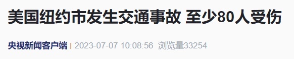 综合美国广播公司与《纽约邮报》报道,当地时间7月6日,美国纽约市发生一起交通事故,两辆大巴车相撞,造成至少80人受伤。