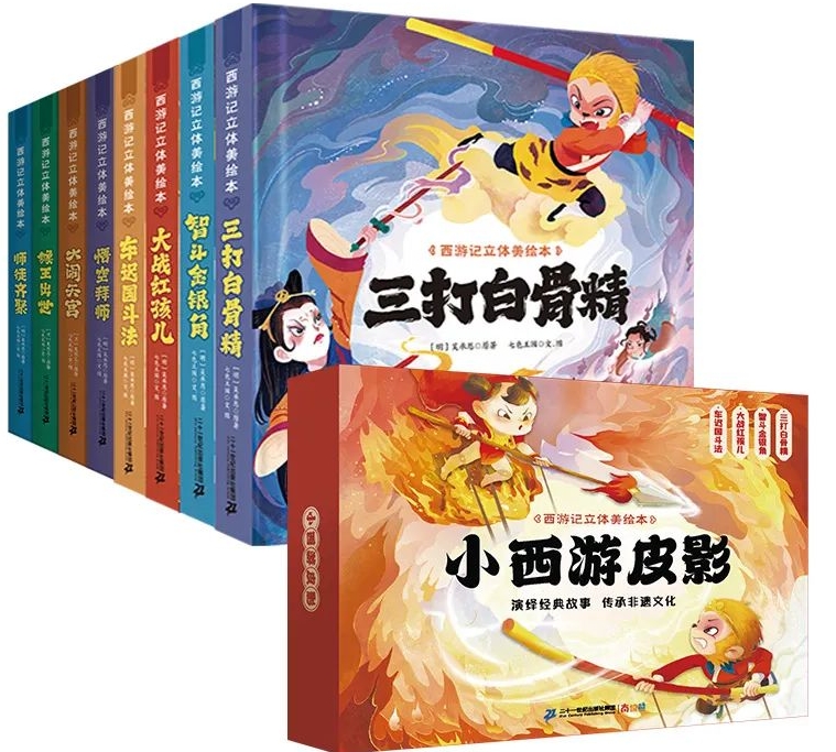 《西游记立体美绘本》由二十一世纪出版社集团与七色王国创作团队历时三年创作而成。该书选取《西游记》中经典故事,采用纸张(胶片)模切、穿插组合、局部特种印刷工艺等手段,配合书中书、拉页和弹跳页设计。