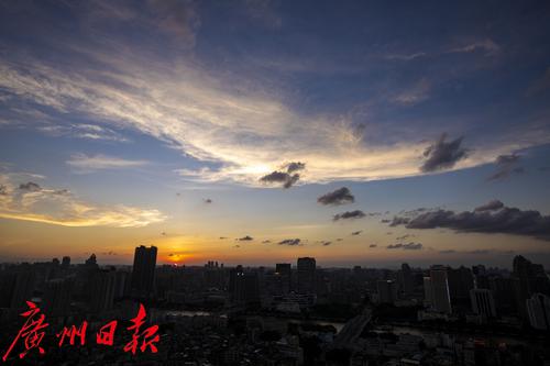 7时40分许,广州西边天空的天际线泛起橙红色的日落余晖。