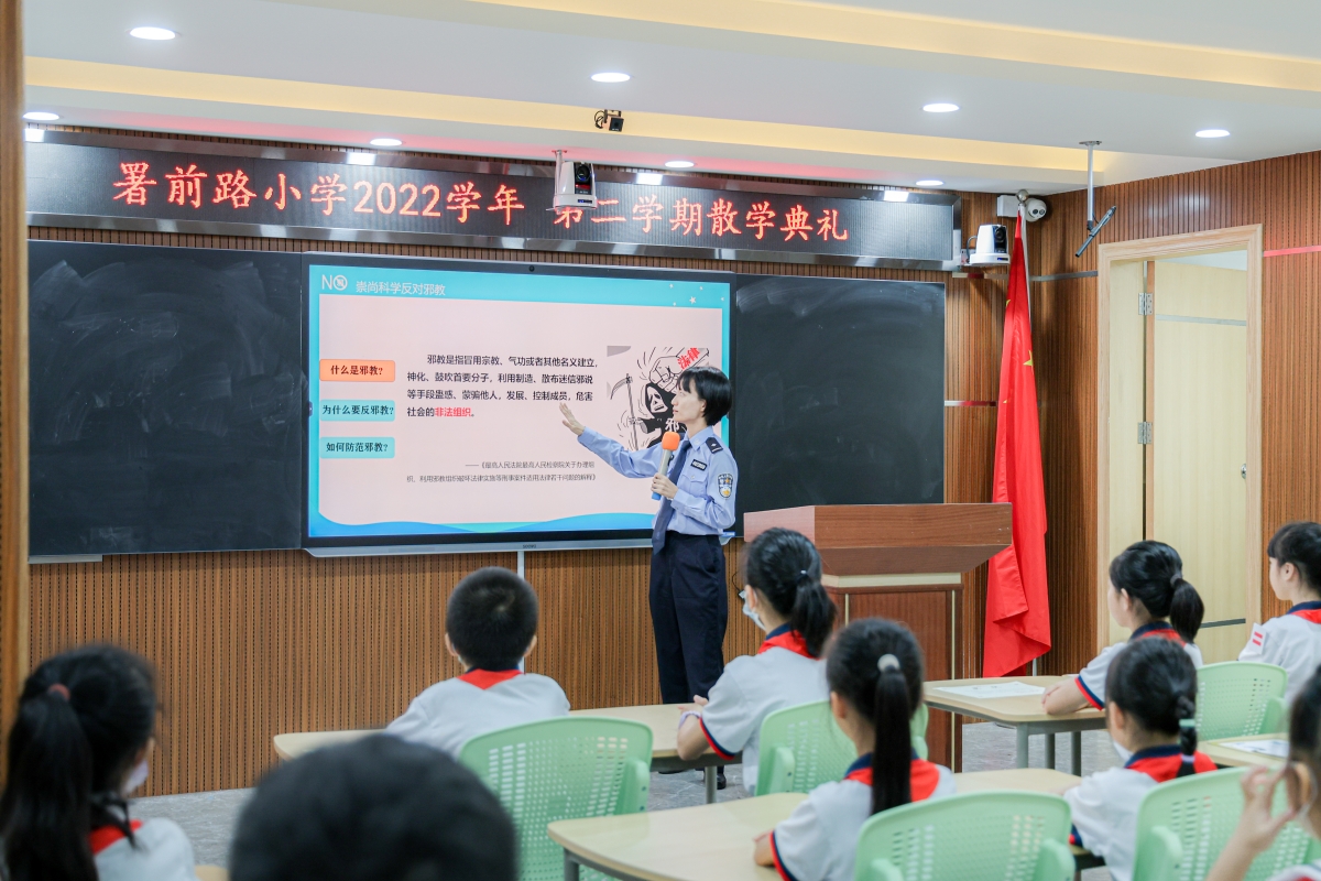 针对青少年学生等易感人群,广州市越秀区委政法委与共青团越秀区委员会共建打造全市首个“来穗青少年反邪普法关爱站”(简称关爱站),现场结合假前安全教育工作,邀请市法制教育管理所专家走进署前路小学开展“线上+线下”反邪教知识小课堂。后续关爱站为区内来穗青少年恒常开展反邪、普法、关爱服务,并将整合更多社会资源融入关爱站,为青年健康生活提供更多服务,保障青少年健康发展。