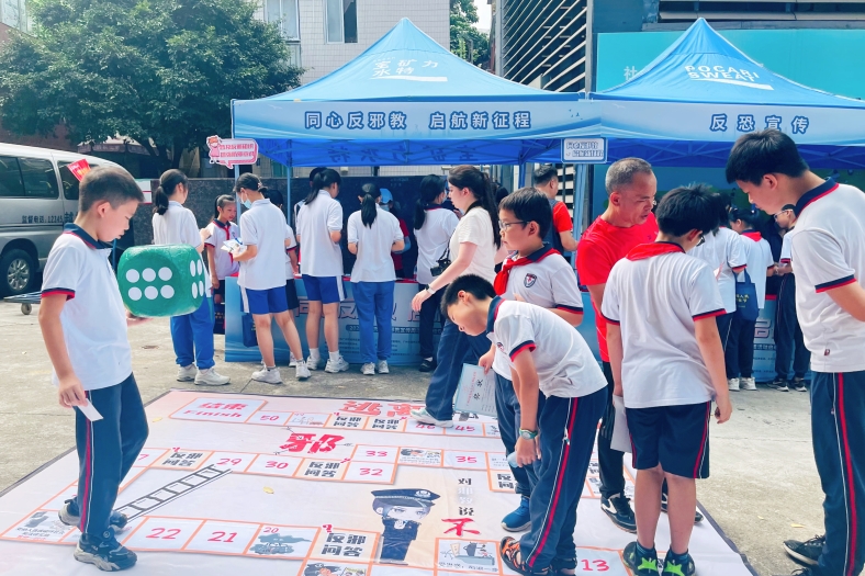 现场宣传摊位上把该桌游放大为地面游戏,吸引了不少学生、路人停留PK。据悉,该桌游将会免费派发给街道、志愿驿站、学校及热心反邪教事业的队伍使用,鼓励在宣传周及日后工作中以更加喜闻乐见的形式开展反邪教宣传系列活动。