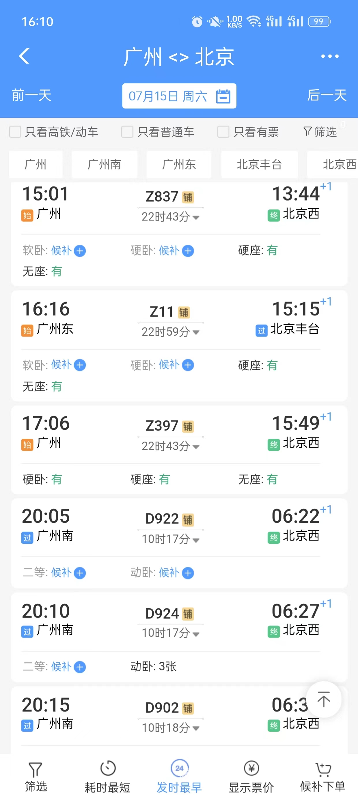 记者查询广州到北京的车次,在查询车票界面上写有“铺”字标识的车次可以进行选铺服务。
