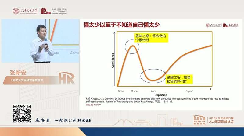 “人类领导者是否会被AI替代”这一话题在论坛上获得了较高关注。上海交大安泰经管学院组织管理系教授张新安为大家揭秘了有趣又深刻的效应和实验现象——“邓宁-克鲁格效应”(人类在新的领域内往往存在“懂太少以至于不知道自己懂太少”的现象)。张新安和团队通过问卷调研发现,在行业里,越是懂AI的人越愿意跟学者谈AI,越会将AI视作机遇而不是视作威胁。