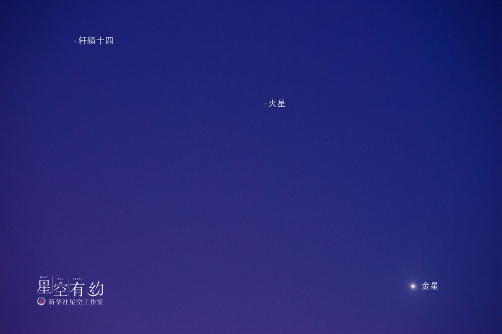 本次相合,火星与轩辕十四最近时仅有0.7度,就比一个满月视直径(约为0.5度)大一点,不过受日光影响,无法看到它们相距最近时的情景。好在当天20时左右,两星近距离争辉的场景在渐黑的暮色中依然会呈现,感兴趣的公众可以尝试观测。