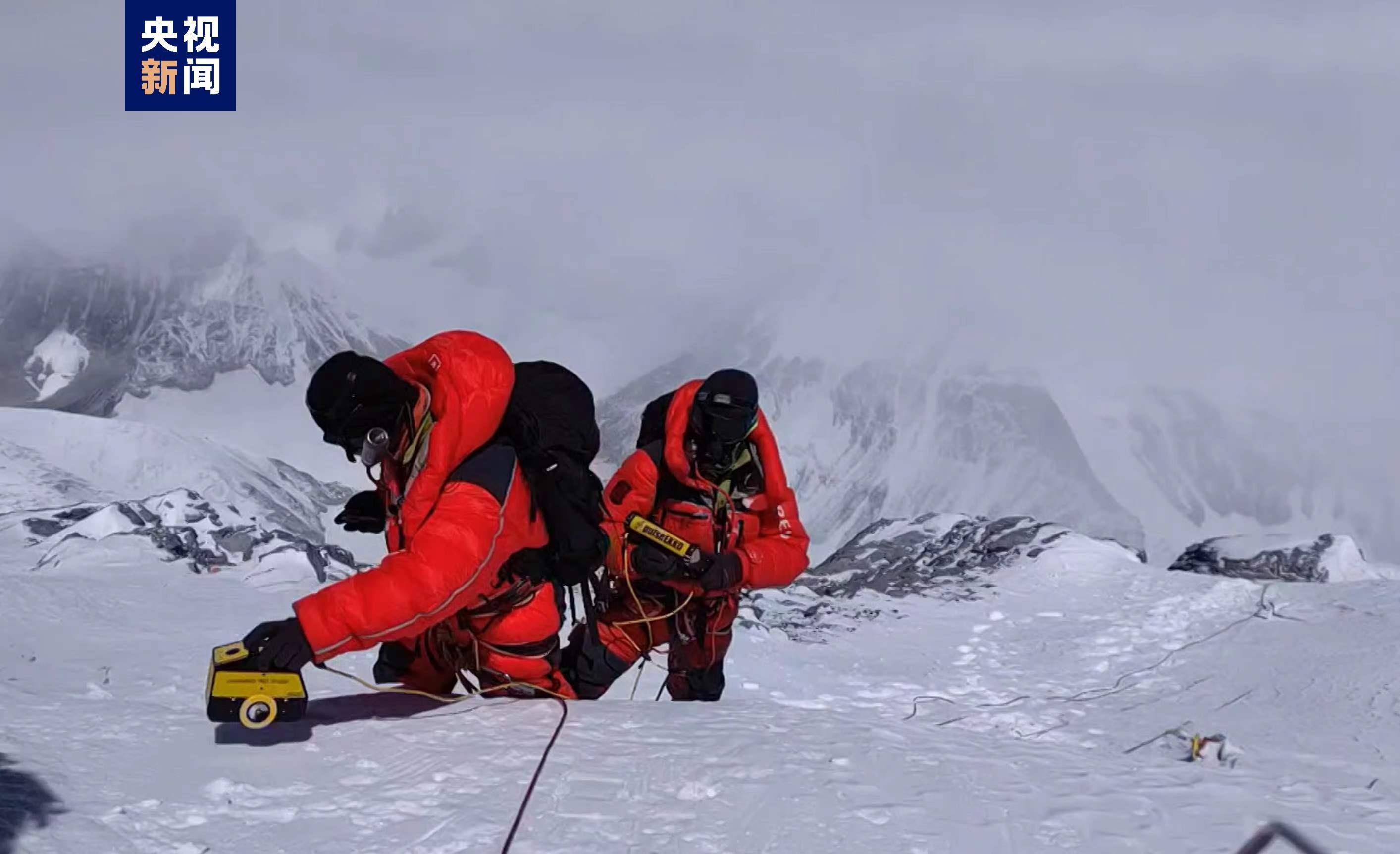 △2022年5月4日,“巅峰使命”珠峰科考登顶科考队员在珠峰峰顶展开测厚工作