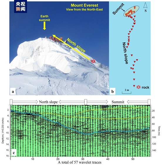 (c):珠峰北坡及顶部的雷达图像,蓝线表示积雪—基岩的雷达波反射界面,黄线表示不同性质雪层的可能界面。