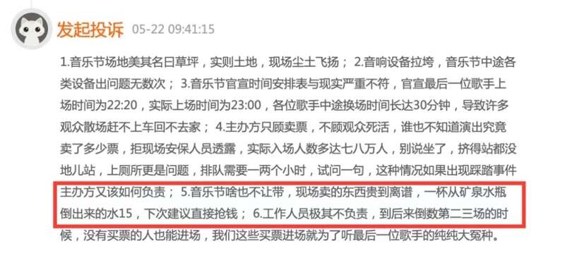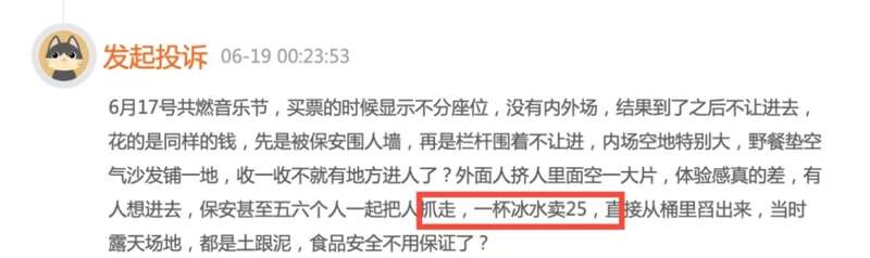 此外,法治网研究院在黑猫投诉平台上发现,网友对音乐节的各种问题投诉不少,也有不少网友提出水价售卖过高的问题。有网友表示,有音乐节现场一杯矿泉水售价15元,还有更离谱的卖到25元。