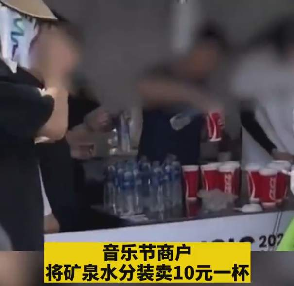 近日,天津唛恩音乐节期间,就有网友发视频称,音乐节场地内有商户将矿泉水分装后卖出10元一杯的价格。视频中显示,商户摊位上标有常温及加冰矿泉水均10元一杯,有工作人员正将瓶装矿泉水倒至杯中分装售卖,不少人正在排队购买。