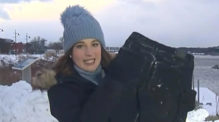 美国有线电视新闻网(CNN)记者梅丽莎·库尼(Melissa Cooney)展示牛仔裤在15分钟内冻成冰块 图/CNN