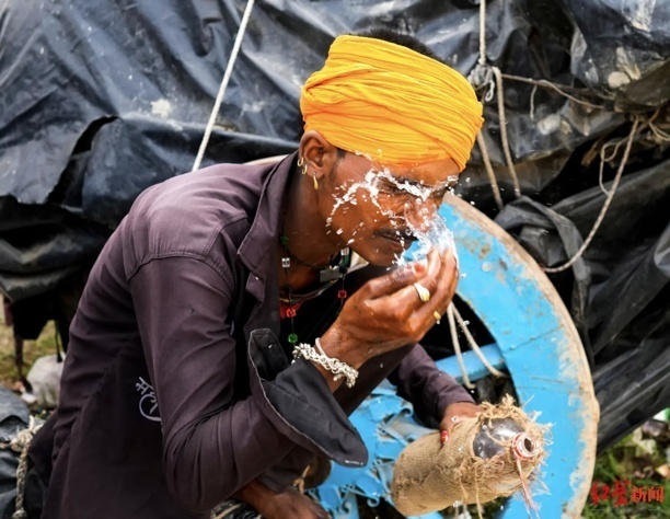 图为一名印度人正在用水给自己降温。图/红星新闻
