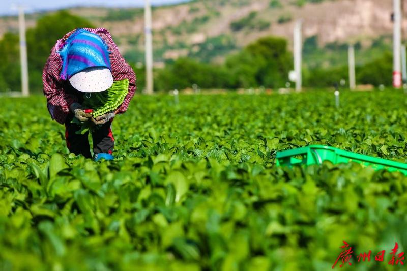 盛夏七月,我国迎来“北菜南运”高峰期。日前,宁夏冷凉蔬菜节暨全国知名蔬菜销售商走进宁夏活动在固原市举行。广州日报·新花城记者走进固原市的果蔬种植基地,圆滚滚的西瓜长满藤蔓,菜心翠绿鲜嫩,工人们正忙着采摘、分拣、打包、装运。