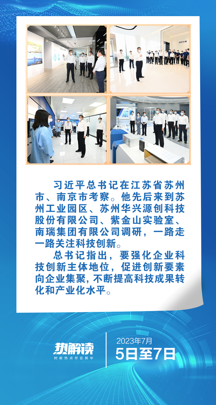 7月5日至7日,习近平总书记在江苏省苏州市、南京市考察。此次江苏行,总书记先后深入苏州工业园区、苏州华兴源创科技股份有限公司、紫金山实验室、南瑞集团有限公司调研,一路走一路关注科技创新。