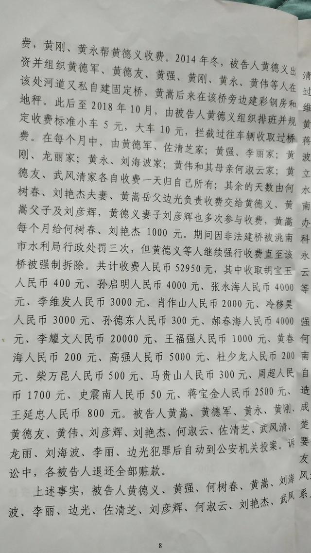 “我哥、侄儿十几口人都参与建桥了,本来就是自发的,没工钱,我也给不了工钱,就收过路车点钱,但是不强制,你愿意给就给,不给也让过。”黄德义否认了判决书上的“共收取过路、过桥费52950元”的说法。