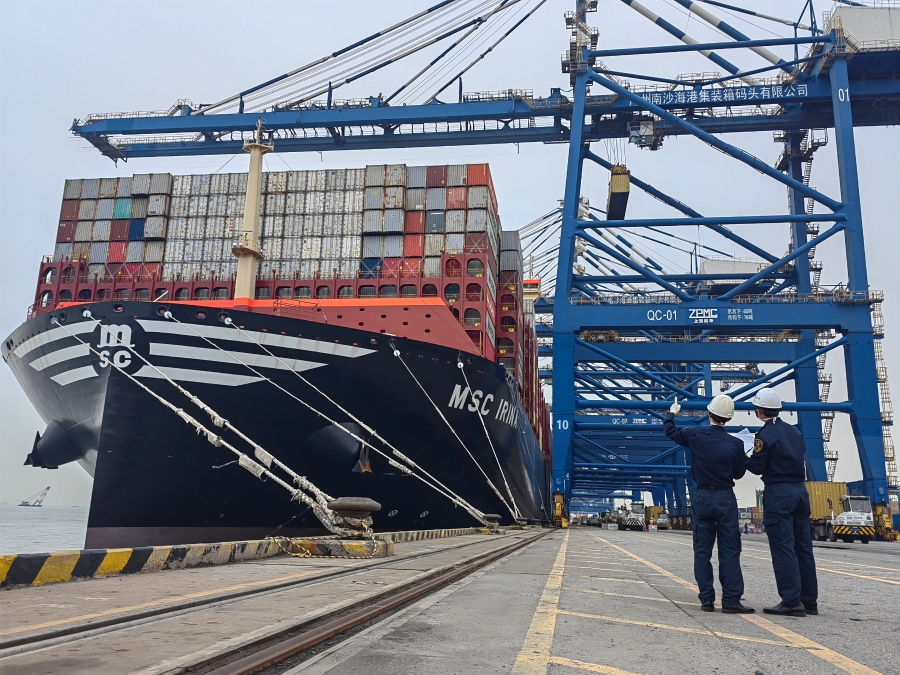 图说:广州海关所属南沙海关关员对中国制造全球最大集装箱货船“地中海伊琳娜”进行监管