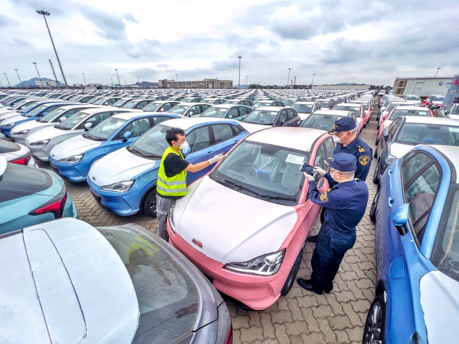 7月6日,烈日下的南沙汽车码头一片繁忙,广州海关所属南沙海关关员对即将出口的国产新能源汽车进行现场抽核,随后这批934辆新能源汽车搭乘“瓦利恩先锋”号外贸滚装船,运往东南亚地区。