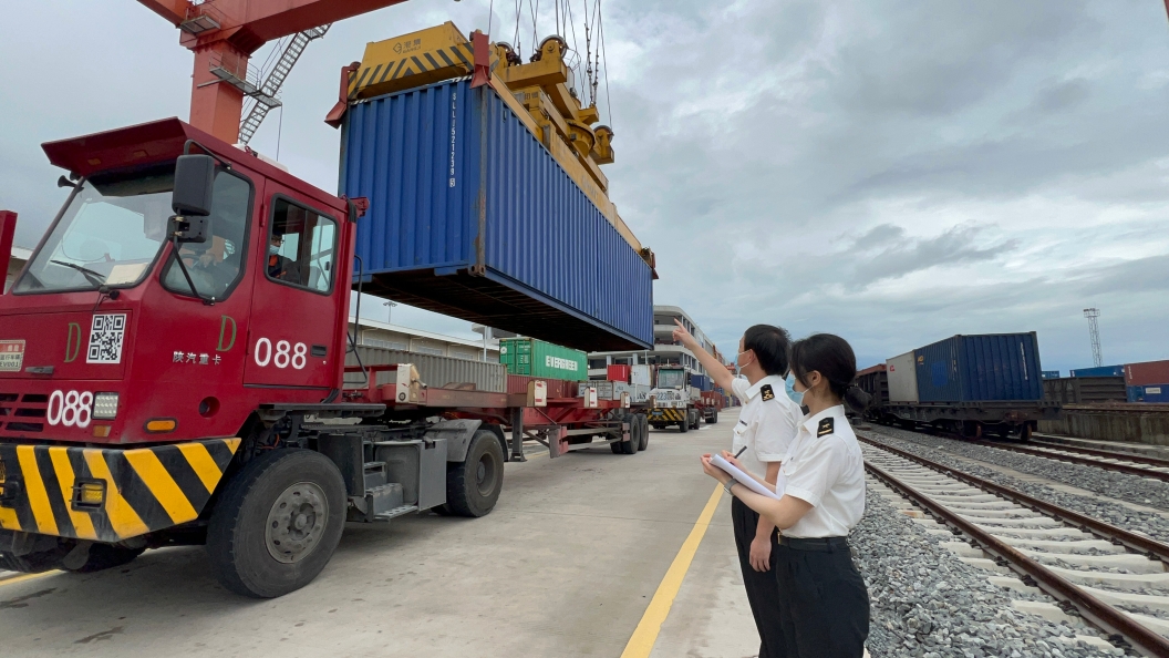 图说:广州海关所属南沙海关关员在南沙港铁路场站对即将发运的海铁联运班列进行监管