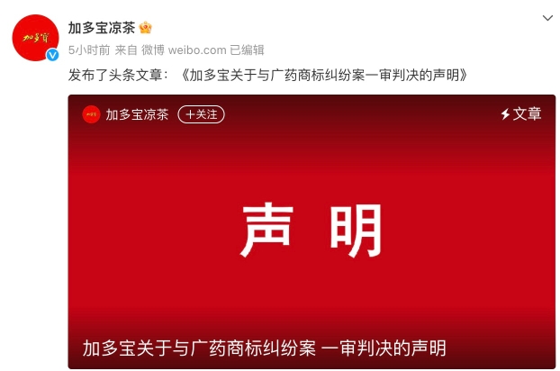 图为加多宝凉茶官方微博发布声明