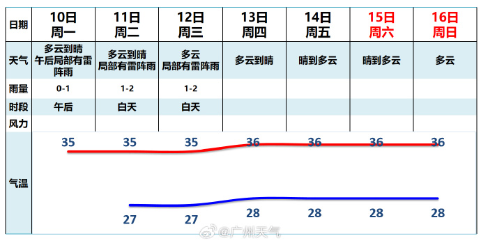 据@广东天气,受副热带高压控制,今起3天,广东大部晴间多云为主,天气持续炎热,有大范围的35℃~36℃高温,局部市县37℃左右。广州本周的最高气温,也会达到36℃。