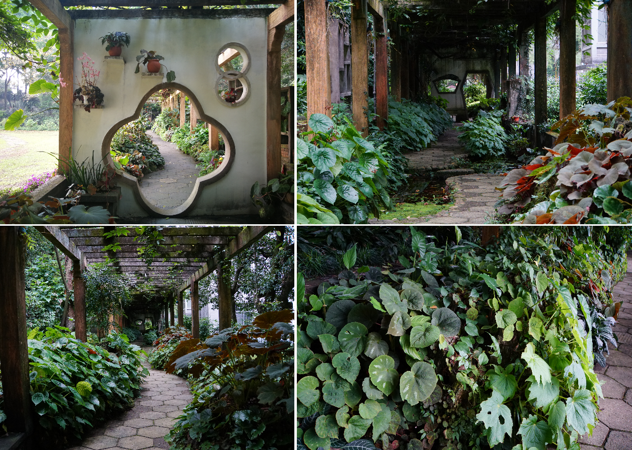 秋海棠植物展示区则利用藤架营造出适宜秋海棠生长的荫蔽环境,多种多样的秋海棠在嶙峋的山石上、蜿蜒的小路边茂盛生长,形成一条幽静繁茂的秋海棠长廊。