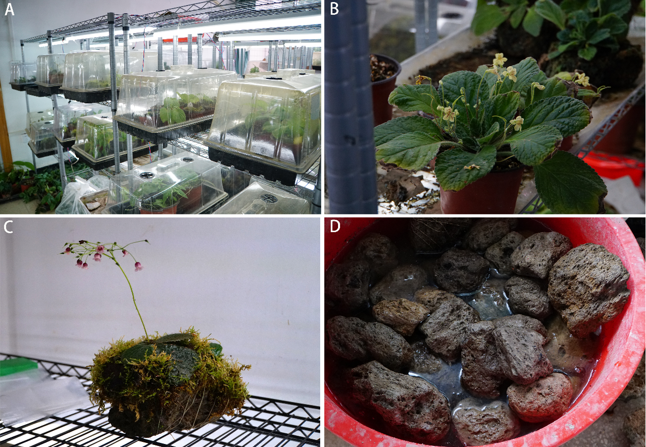 苦苣苔育苗室(A),盆栽和石栽的苦苣苔(B、C),用于石栽的石块(D)