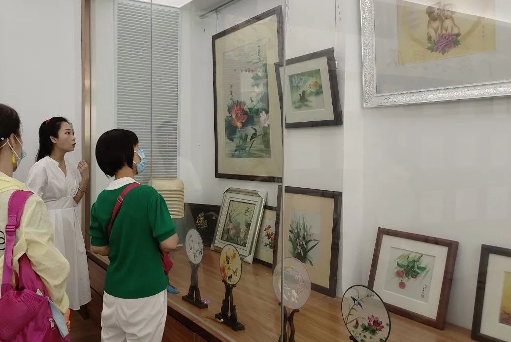 现场学习之后,谭靖榆带大家来到陈少芳广绣工作室体验广绣作品的魅力。工作室珍藏着陈少芳老师的广绣作品,大家在谭靖榆的讲解下,直观了解陈少芳老师广绣作品的构图、素材选取、针法等技巧及元素。