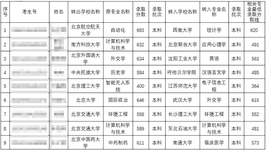 这9名本科生中,向某从北京航空航天大学自动化专业(录取分数683分)转入西南大学统计学专业(相关专业最低录取分数线为620分);尉迟某某从南方科技大学计算机科学与技术专业(录取分数632分)转入北京联合大学应用心理学专业(相关专业最低录取分数线为491分);冉某从中央民族大学历史学专业(录取分数584分)转入呼伦贝尔学院汉语言文学(相关专业最低录取分数线为485分);闫某从北京大学国际政治专业(录取分数646分)转入武汉大学外交学(相关专业最低录取分数线为615分)。