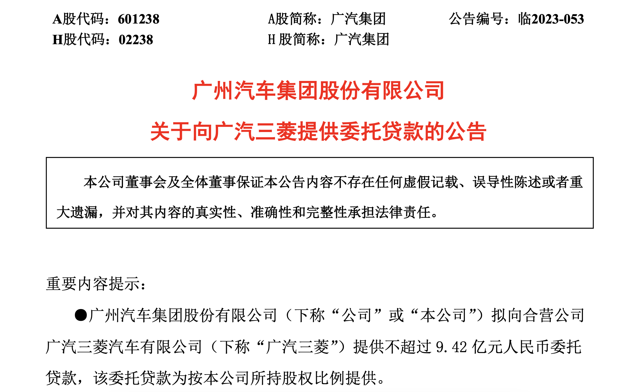 今年6月21日,广汽集团发布公告,经股东各方协商一致,同意各方按各自所持股比向广汽三菱提供总额不超过18.84亿元人民币的资金支持。其中,广汽集团按股比(50%)提供不超过9.42亿元人民币委托贷款,贷款利率以参考同期 LPR并经股东方协商一致及依实际情况厘定,期限一年。