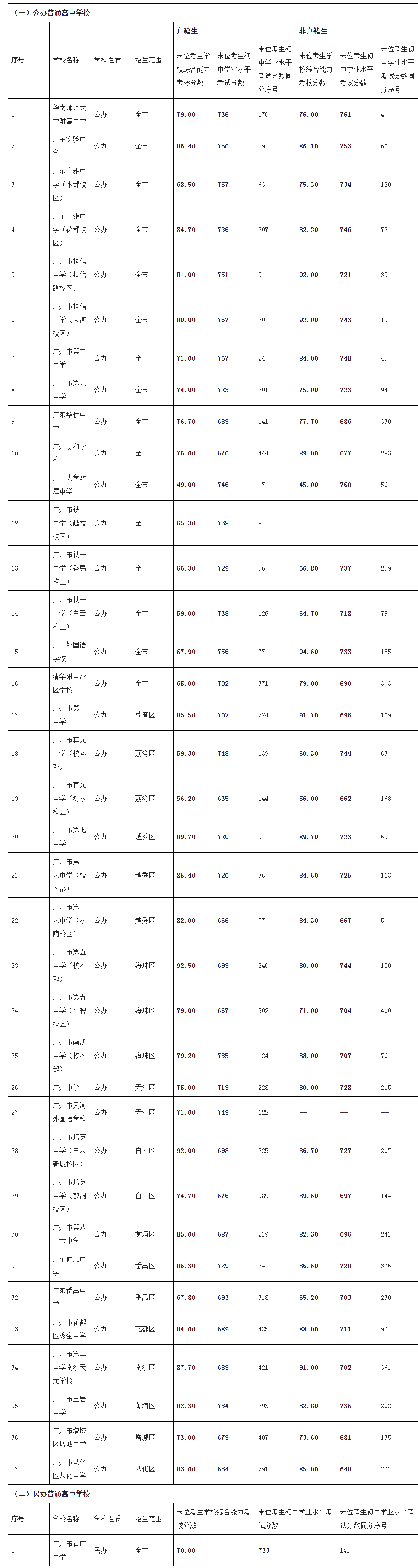 1.表中“户籍生”是指广州市户籍的考生,政策性照顾学生与户籍生报考和录取资格相同;“非户籍生”是指符合公办普通高中报考条件的随迁子女。