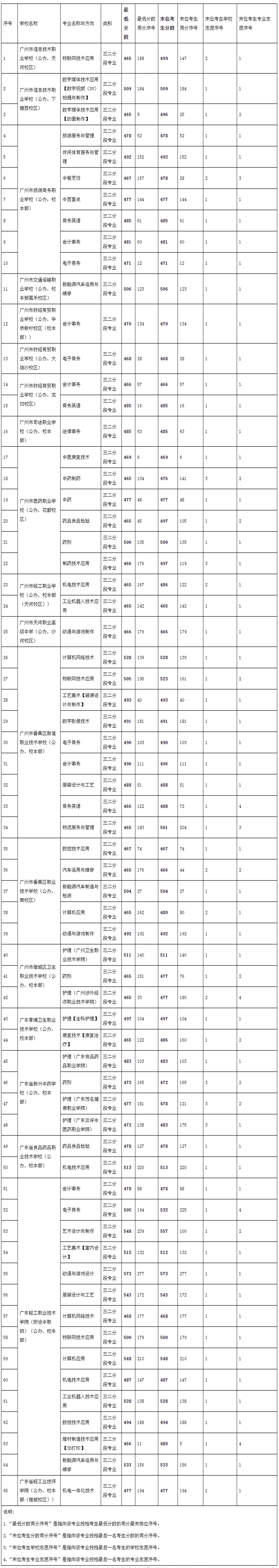 广东黄埔卫生职业技术学校、广东轻工职业技术学院(附设中职班)、广州市信息技术职业学校、广州市旅游商务职业学校、广州市财经商贸职业学校、广州市交通运输职业学校、广州市番禺区新造职业技术学校的护理、中餐烹饪、电子商务、动漫与游戏设计、物联网技术应用、机电技术应用、工业机器人技术应用、新能源汽车运用与维修、计算机网络技术等65个专业招生计划完成率100%。